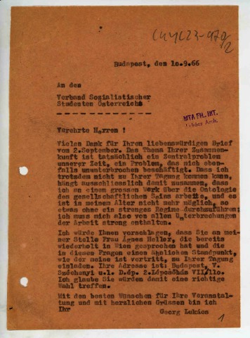 Lukács, György (1966) Lukács György levele Peter Kreiskynek és Herbert N. Andersonnak. , Budapest (Kézirat)