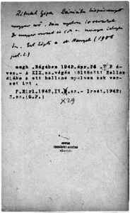 Gulyás Pál (1881-1963) jeles irodalom- és könyvtörténész, bibliográfus, akadémikus vállalkozott arra, hogy folytassa Szinnyei József: Magyar írók élete és munkái című művét. A ma is nélkülözhetetlen lexikonból 1939 és 1944 között A-Dz betűig hat kötet jelent meg. A lexikon alapjául szolgáló gyakran kézírásos, rossz alapanyagú, másodlagosan felhasznált papírdarabokra írt cédula-anyag az MTA Könyvtára Kézirattárába került. 1990 és 2002 között Viczián János sajtó alá rendezte E-től Ö betűig a cédulákat. Állandó az igény a Gulyás-féle anyag iránt, a cédulák azonban rossz állapotban vannak. Az IHM „24. óra – Kulturális kincseink digitalizálása” címen kiírt nyertes pályázata segítségével állagvédelmi okból az MTA Könyvtára digitalizálta (2004), s az internetre feltéve a széles nagyközönség számára hozzáférhetővé tette a hiányzó P-Zs betűk céduláit. |