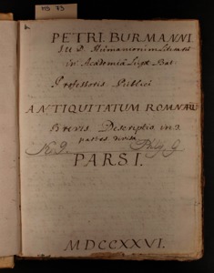 Burmann, Petrus (1726) Petri Burmanni Ill. D. Humaniorum Literatu[m] in Academia Ludg. Bat. professoris publici Antiquitatum romanaru[m] brevis decriptio in 3 partes divisa. Pars I. , n.a. (Kézirat)